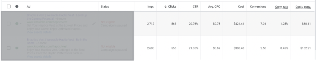 A/B testing (also known as split testing) is a technique where you create two or more variations of an ad, landing page, or call-to-action to see which version performs better. Regular A/B testing in search advertising best practices will help refine your approach and lower your overall costs. Ad texts A/B testing is one of the important SEM tips. Here is an example of Ad texts A/B testing.